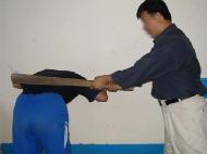 迫害还在继续,恶警李军指使刑事犯人每天把床上铺的褥子拿掉,在床板上从早上三点一个姿势(开饭除外)一直坐到晚上十二点。稍动一下就遭毒打,坐了三天,天天如此。刑犯中的邪恶之徒周伟春还拿着香烟威逼班内的每个大法学员抽,轮到我,我就是不抽,就又遭到一顿毒打。邪恶之徒赵柱还用手掌猛砍我的咽喉,致使我说话都费劲。