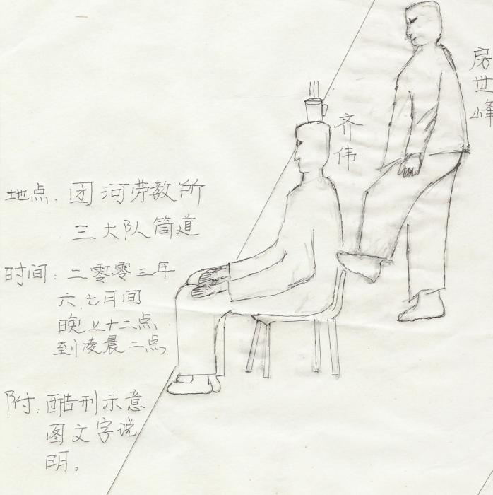 恶警为达到让齐伟屈服的目地,指使刑事罪犯房世峰,在黑夜齐伟“坐板”的时候折磨他。让齐伟的两脚、两腿并拢中间不能留空隙,双手放在膝盖上,全身坐直不准动。还让齐伟的头上,顶着盛满开水的热水杯,只要稍微一动开水就会洒出烫到身体、头。房世峰还不停的对齐伟打、骂、踢、拧。齐伟的身上、腿上到处都是紫一片、红一片的。恶警还指使高祥等普教对齐伟毒打。强迫让齐伟抄写邪恶编写的污蔑法轮功的书。邪恶之徒每次对大法弟子進行迫害的时候都是在深夜大家都休息以后,或者是没有人的地方。
