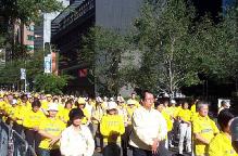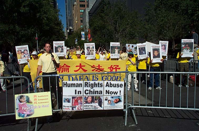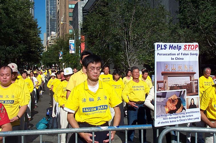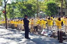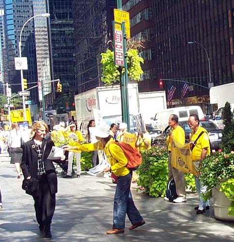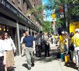 中午至下午两点,在曼哈顿第三大道上,从43街到57街,法轮功学员用“帮助停止迫害法轮功”、“法轮大法好”等黄底蓝字的小横幅、各式各样揭露迫害讲清真象的展板以及他们坚定的信念和不屈的精神组成了一道“勇气长城”。