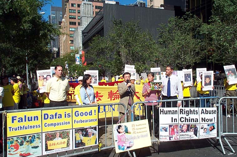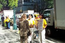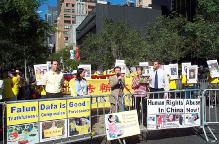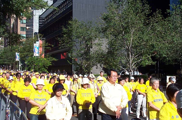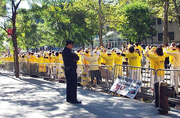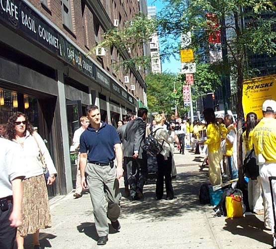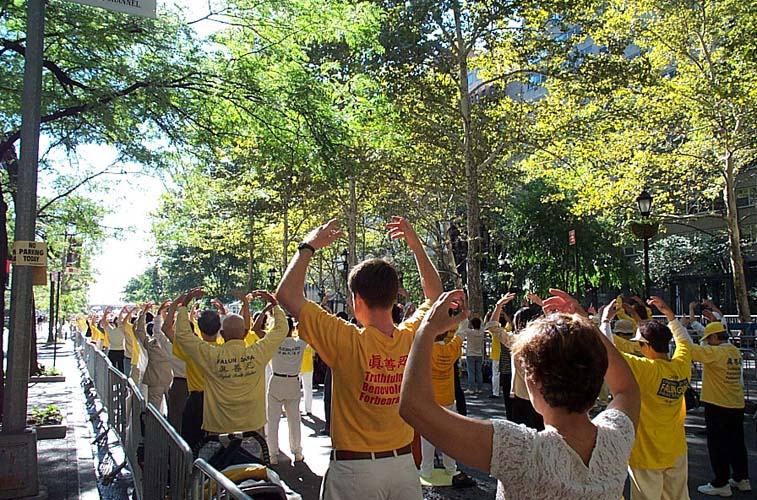 早晨9点,法轮功学员开始了在联合国广场前的集体炼功。自99年7月江氏集团发动了这场荒唐无理的迫害以来,五年多来,法轮功学员们曾无数次来到这里揭露迫害,呼唤正义良知。学员们的请愿一如既往的安宁祥和,舒缓的炼功音乐,庄重的炼功场面,展示出的是法轮功学员们的和平与坚毅。