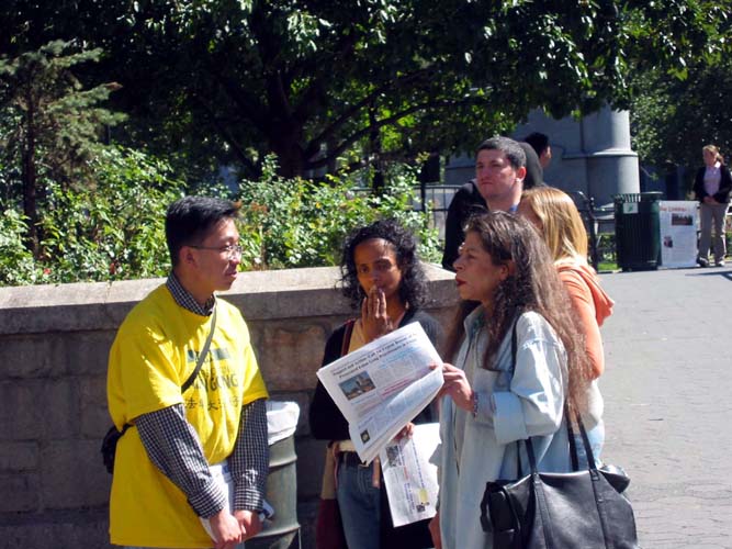 来自台湾的陈国峰医生说他这一个星期都会在纽约参加讲真象的活动。据他介绍,本周大约有两百多位来自台湾的法轮功学员在这里参加活动。陈医生和一旁的几位台湾学员表示:“我们和大陆同胞一样是炎黄子孙。我们和大陆的法轮功学员同修一部法,同炼一个功。在台湾,我们可以自由学炼,身心受益,而大陆同修却惨遭江氏集团迫害,身陷囹圄。对大陆同修的遭遇,我们台湾学员无法做到置若罔闻,我们一定要让更多人了解这场迫害,知道镇压有多么残酷。知道真象的人越多,迫害就会越早停止。正是基于这样的心愿,所以我们很多台湾学员即使经济不是很宽裕,也不惜旅费,尽量安排好工作、家庭,千里迢迢来参加海外的讲真象活动,希望能为停止在大陆的迫害尽一点绵薄之力。”