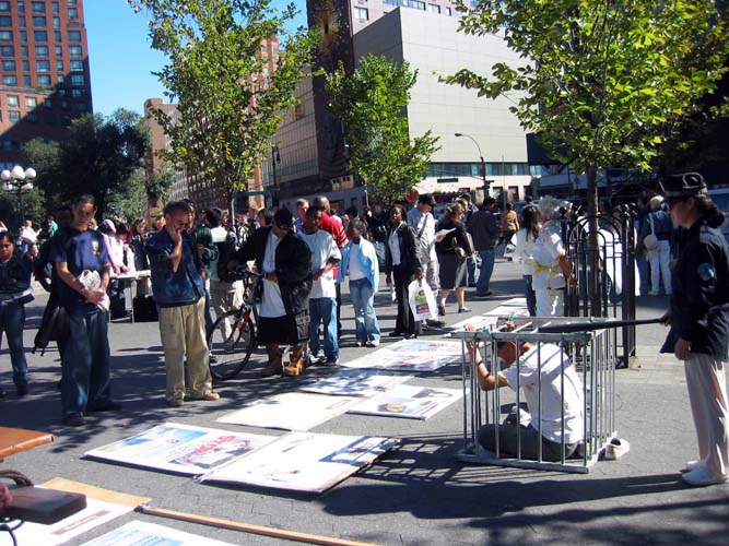 反酷刑展是法轮功学员今年新采用的一种揭露迫害、讲清真象的方式。通过真人模拟演示出江氏集团迫害法轮功学员的种种残酷手段。虽然展示的惨烈程度远不能与大陆法轮功学员实际承受的相比,但仍然令观者为之震惊。