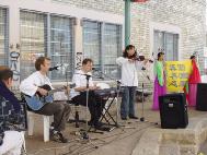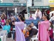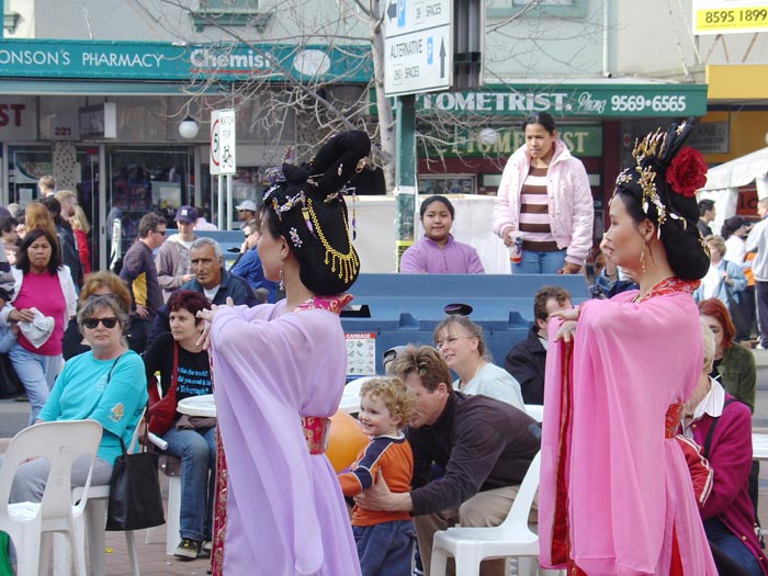于是,大法弟子们精心装扮一番,为当地人带来了唐装表演,仙女舞蹈,吉他、小提琴合奏和演唱,小弟子们也跳起了星星舞。两位装扮成仙女的学员在舞台上打着“真善忍”的横幅作为背景,舒缓的音乐和表演与周围的喧闹形成鲜明的对比,仿佛一股清流,吸引着人们近前观看。其他学员在一旁发资料、征签。文艺表演进行中间,学员们示范了5套功法,并在台上通过麦克风介绍了法轮大法。