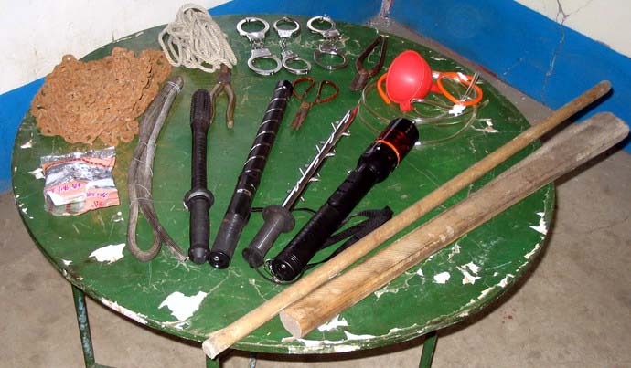 其中包括:高压电棍、手铐、带头的胶皮棒里面灌铅的狼牙棒、带刺的狼牙棒、铁链、木棍、镐把、三角带、铁钳子、铁剪子、捆绑用的绳子、灌食用的插管、漏斗、灌食用的食用盐。