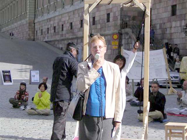专门从事人权问题的欧洲议会议员,瑞典国会议员海林娜•巴依赫尔兹女士(Helena Bargholtz)在会上发表了讲话,支持法轮功学员与人权律师起诉迫害法轮功学员的责任者的正义之举。她在发言中最后说:我钦佩法轮功学员们的勇气, 特别是那些在中国还在遭受迫害的法轮功学员们的勇气!