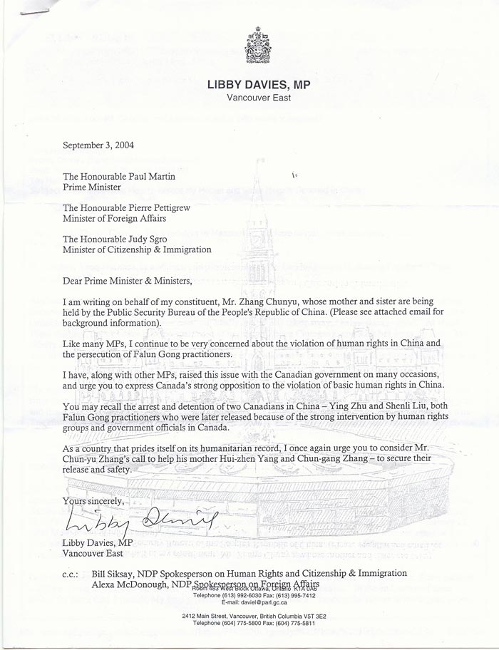 我和其他许多议员一起在很多场合向加拿大政府提起这一事件并且敦促你表达加拿大政府对中国侵犯基本人权表示强烈反对。
