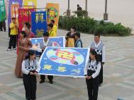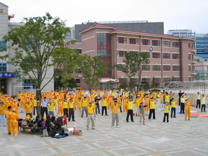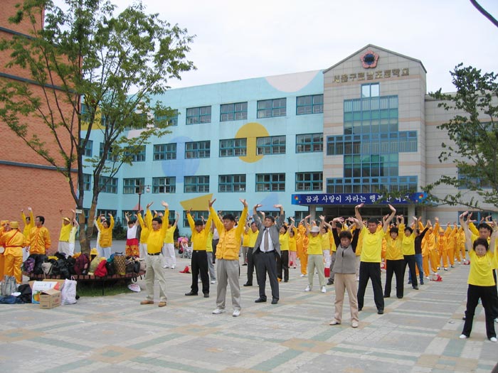 当日下午一点发正念后,游行队伍从汉城南九老小学正式出发,在身着传统韩服、手擎法轮图形的大法弟子引领下,彩旗队、腰鼓队、锣鼓队和明慧学校等法轮功学员伴着欢快的鼓乐表演着各自丰富多彩的节目紧随其后,印有“法轮大法好”及大法洪传世界和江XX被起诉的各色横幅连成了两条彩色的长龙,一对威猛的金色雄狮伴着游行队伍欢快的跳跃着。