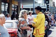 下午,法轮功学员还进行了唐装表演、舞蹈、四人乐器合奏和歌唱表演。演出的乐曲都是西人学员自己创作的,柔美的音乐令周围的空气都变得柔和,行人纷纷驻足聆听,感受这音乐中体现的宇宙之静谧与天人合一的自然,并从演奏者发自内心的笑容中解读这生命同化宇宙特性后的祥和。一位观众久久地站在那里,专注地看着学员的表演,似乎与演奏者一起,融入在音乐之中。一曲奏罢,他仍沉醉其中,似乎余音未绝,目光长久地驻留在学员身上。