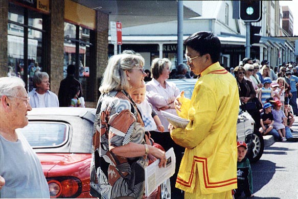 过去,当地西人学员曾经向该地区的联邦议员Mr. Alby Schultz讲真象,发给他的电子邮件却未收到任何答复。在游行开始之前,由于许多车辆都向着游行起点方向开去,交通偶尔出现堵塞。此时,议员乘坐的车辆恰好停在法轮功学员的信息台前,议员有时间观看到身穿黄色衣服的学员们展示功法。舒缓的动作、宁静的炼功音乐和学员们祥和的表情,使议员对法轮功有了感性认识。