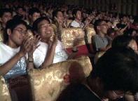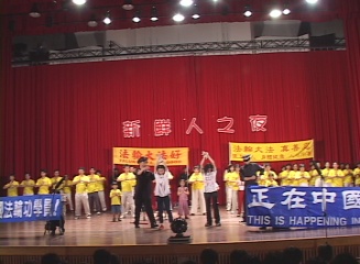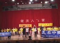 ![]() 第三幕:坚贞的大陆法轮功学员 | ![]() 第四幕:大法洪传世界、全球审江 | ![]() 晚会学生报以热烈的掌声 |