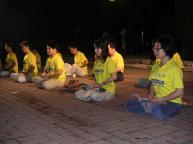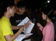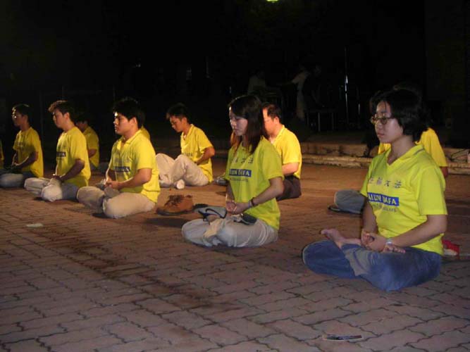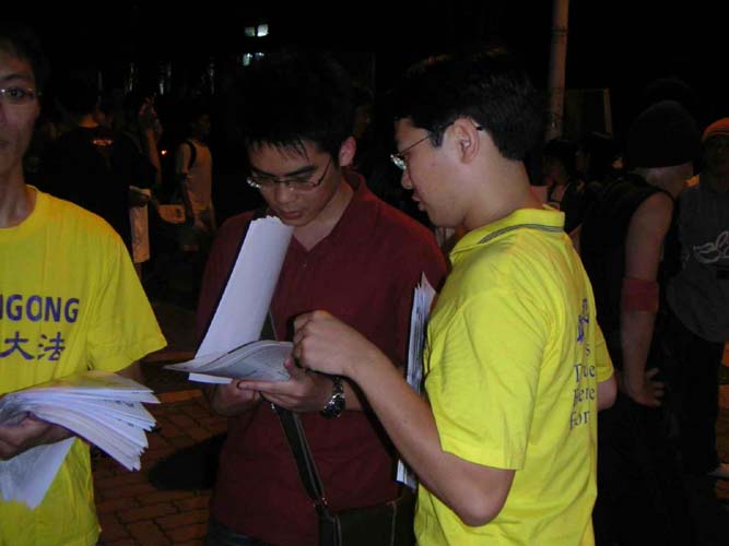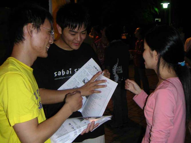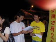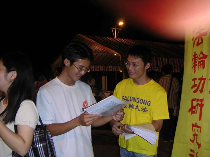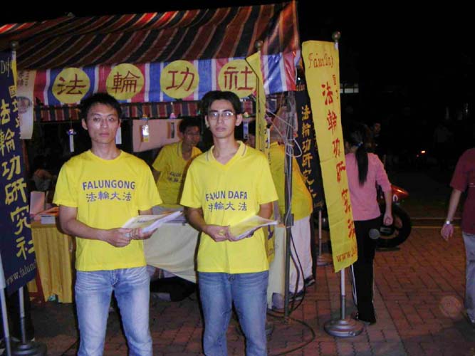 九月十五、十六日从下午五点到晚上九点半是成大社团联展的时间,所有的社团都利用这个时间设置摊位,用以向新生详细介绍社团,并招收新社员。来自台南县市的法轮功青年学子也利用这个机会向成大新生介绍法轮功。学员们在摊位前进行功法展示,并发送法轮功简介、学员修炼心得及揭露江氏迫害法轮功的传单。学员们也申请在社团联展摊位前的动态表演区,做20分钟的功法表演。在功法解说后告诉大家,江氏集团迫害法轮功的黑手也伸向海外与台湾的法轮功学员。