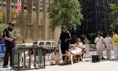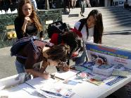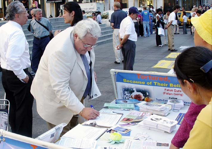 记者与几位学员在街头举着展板,发资料的时候,也遇到很多明白了真象的纽约人急切的询问,在哪里可以学功,如何可以帮助停止这场残酷的迫害。一位小伙子在索要了纽约炼功点信息之后,很感谢学员把真象和这样美好的功法带给了纽约人,希望记者帮忙转告其他学员,一定不要停止这样的讲真象活动,一定要坚持下去,让所有的纽约人都了解真象。当记者告诉他,我们一定会坚持下去的。也告诉小伙子法轮功学员这样做也是很不容易的,付出了很多。学员们为了更多的纽约人了解真象,从世界各地来到这里,都是拿出自己的储蓄和假期到纽约来参加活动,而这里的生活费又非常贵。小伙子点点头,很感动的握住学员的手,表示感谢,说你们真了不起。