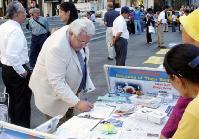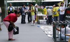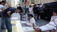 ![]() 高峰会代表下榻宾馆旁的酷刑展 | ![]() 酷刑展旁人们了解真象 | ![]() 人们被残酷的迫害震惊 |