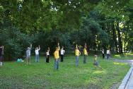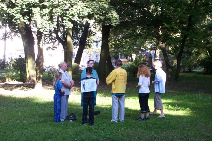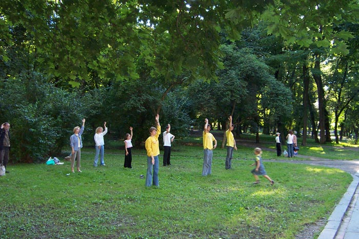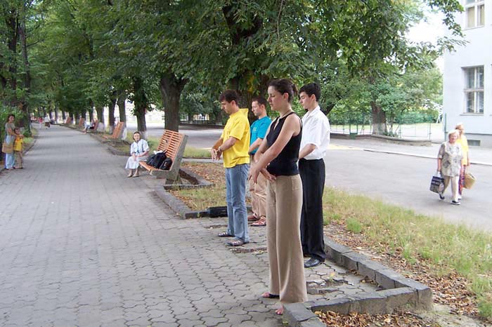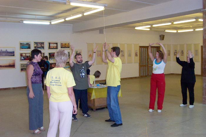 在乌克兰的里沃夫市“慈悲之路”图片展现场 图片展现场教功 |  大法弟子每天在里沃夫市炼功 |  新学员学炼法轮功 |
