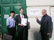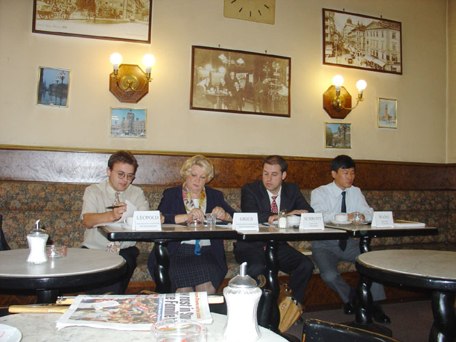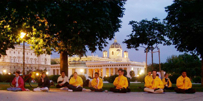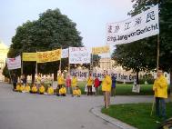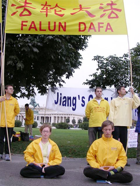 晚间贾到维也纳的奥地利总理府,大法弟子们在总理府前打开横幅。因为横幅举得很高,在总理府楼内的奥国官员和中国代表团都清清楚楚的看到横幅。有中国官员要求奥地利警方让大法弟子把横幅举得低一些,奥地利警方以在奥地利没有对横幅高低的限制而一口回绝了这一无理要求。