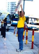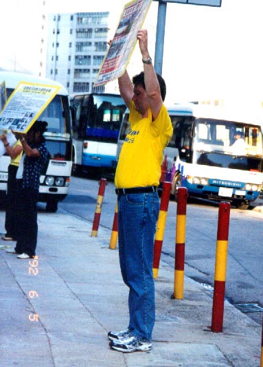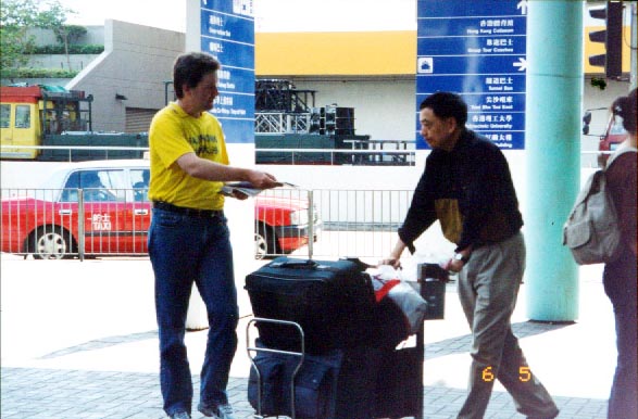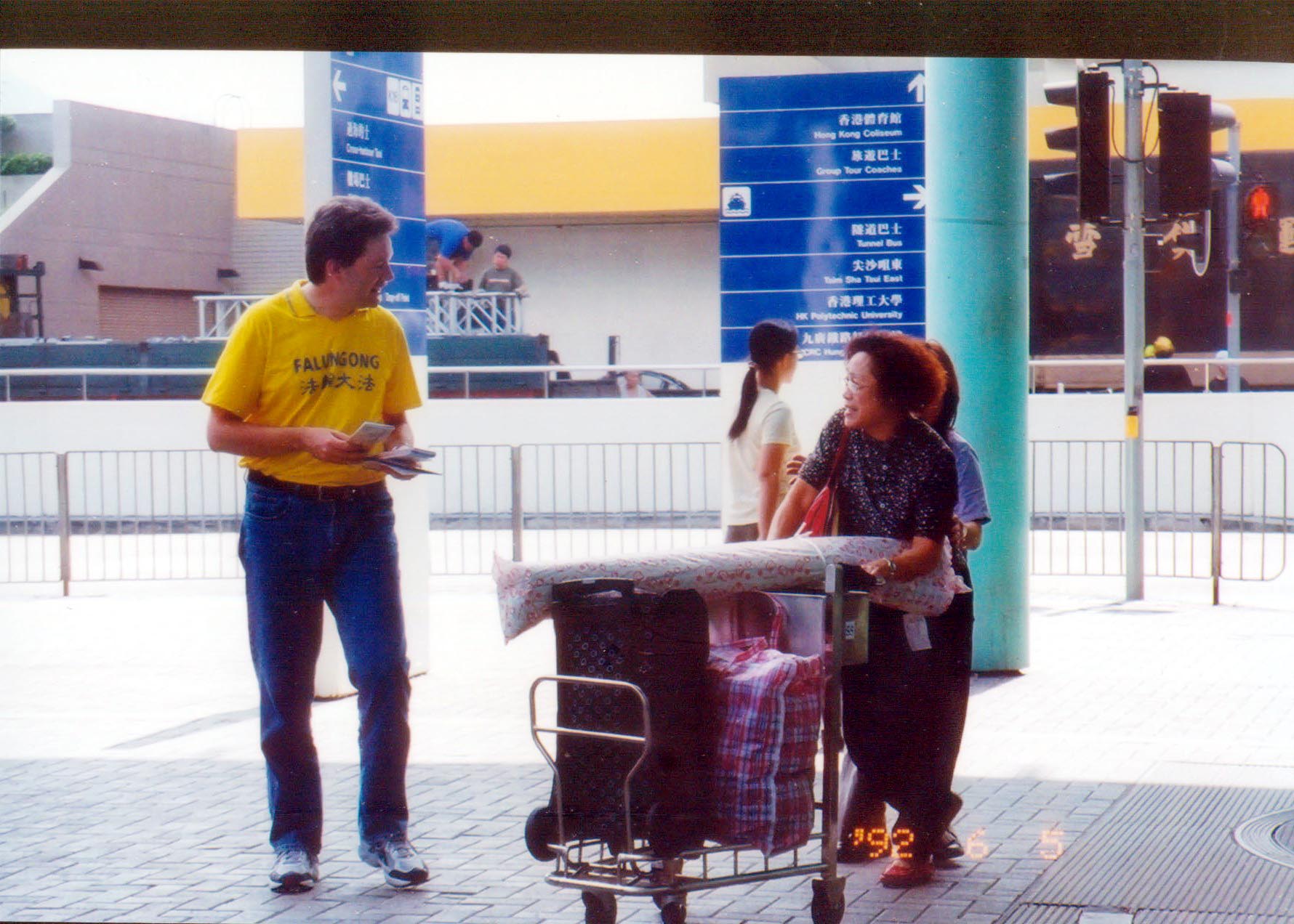 台湾有很好的修炼环境,集体炼功、学法交流,对我的提升帮助很大。通过和台湾学员交流了解,到香港的大陆游客很多,法轮功在大陆被禁止,在香港却是合法的,大部分的中国人受官方所控制的媒体宣传所毒害,不知道法轮功在大陆被残酷的迫害和在海外洪传的消息。法轮功带给我的体会太深刻了,所以就想去香港的车站或旅游景点对中国人讲清真象。当大陆游客看到我时都露出惊讶的眼神,大陆人都知道法轮功发源于中国大陆,没想到在香港会见到一位身穿黄色上衣,上面还印有“法轮大法”字样的白人法轮功学员,我也跟其他香港学员一样用中文跟他们讲法轮功真象。