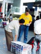 【明慧网2004年9月30日】在香港的车站,有一个身材高大的西人法轮功学员,对着来自中国大陆的游客,双手高举着看板,因为目标显著,一下就吸引着所有人的目光。有时他会找大陆的游客谈话,并发给他们法轮功真象资料。这位金发碧眼的西方人,中文名字叫做莫大卫,修炼法轮功已有四年时间,以下是莫大卫的修炼心得以及他为何要到香港向大陆游客讲清真象。