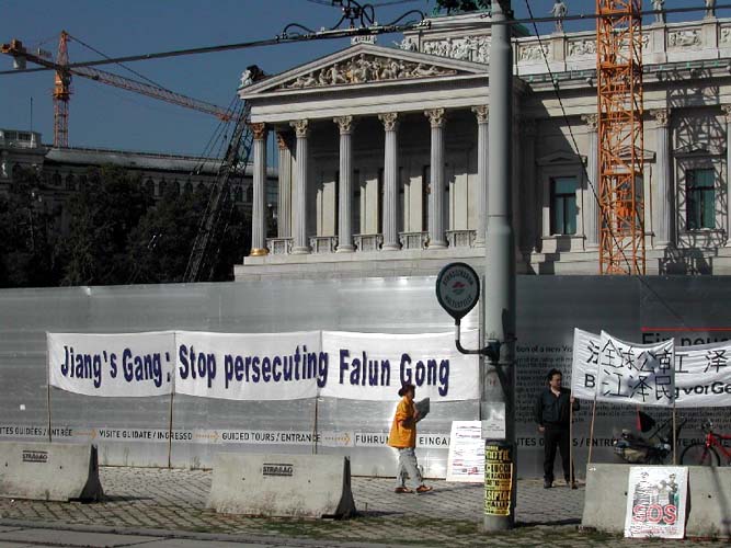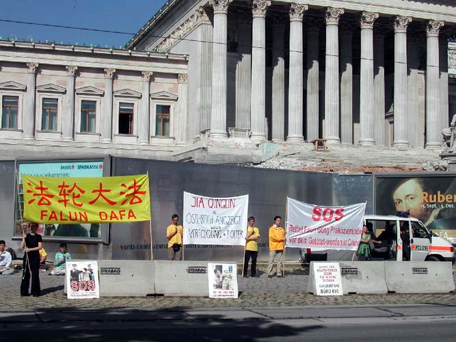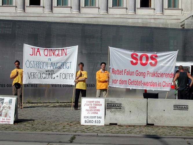 2004年9月2日早晨,贾在离开奥地利前到奥地利总统府。法轮功学员亦在总统府前举行活动讲真象。