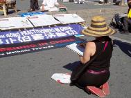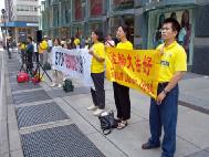 ![]() 西方媒体采访法轮功学员 | ![]() 手举横幅 | ![]() 示范功法 |