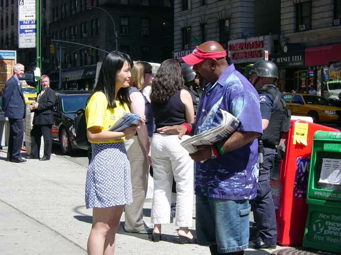 整个洪法活动获得了警察的大力支持。我们一到,警察就在旅馆前划了一块地方供我们使用。据申请这一次在纽约活动许可的同修讲,在申请的过程中,本来72街和百老汇的那个地方一直申请不成,但后来通过讲真象,警察不但给了活动许可,而且连30元申请费都免了。还有好几位警察表示要向我们学习法轮功。