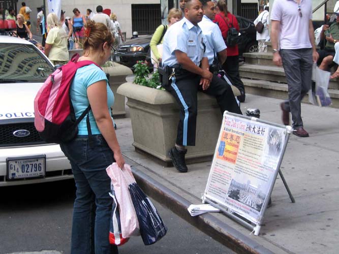 一位仔细看过法轮功真象内容的男士,对功法非常的感兴趣,遗憾的是当时学员手里有曼哈顿炼功地点的传单已被全部发完,只好推荐他上网去找相关的信息。他还说学员应该带书来,现在他只好上网去购买了。