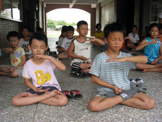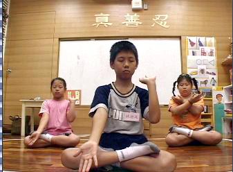 其中教授动功时,小朋友从依样画葫芦到有模有样,在充满祥和的气氛中,很快就学会了;静功是最难坚持的一部分,小朋友们却也能从挤眉弄眼、动个不停至渐入佳境;学法时要求小学员们单盘或双盘,跟随带领的老师一句一句复诵经文,除考验其专心度,更磨炼其耐力,三十分钟下来,小朋友们腿麻、脚痛,在吃苦消业的过程中,明显感受到他们心性的进步!
