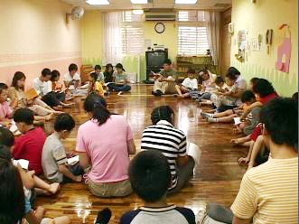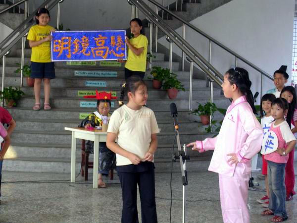2004年7月初由台北明慧学校主办的小弟子九天班,有来自全省各地的法轮功小弟子报名参加,九天的课程包括了学法、炼功以及户外洪法讲真象等。大部分的小弟子都是住宿的,抵达营队没多久,映入眼前的与一般坊间的夏令营似乎没有什么差别:有的小弟子在射飞机,有的则是拿纸剑互砍,甚至射橡皮筋的也有。哭的哭,闹的闹。但是在接下来的几天,大部分的小弟子渐渐的学会了先他后我、为别人着想、考虑到别人的感受,与人有争执时也渐渐的学会了向内找、找自己的错误,在各种的矛盾中起了明显的变化,渐渐懂得将真善忍的法理溶入生活之中。