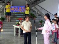 2004年8月13到15日,在台中光复国小举办明慧学校儿童夏令营,以戏剧表演的方式将法轮大法“真、善、忍”的法理溶入活动中。在筹备“让水”与“包公审案”二出戏剧的过程中,对儿童身心健康与善念的启发起到很好的效果,获得参加的家长和小朋友的喜爱和好评。