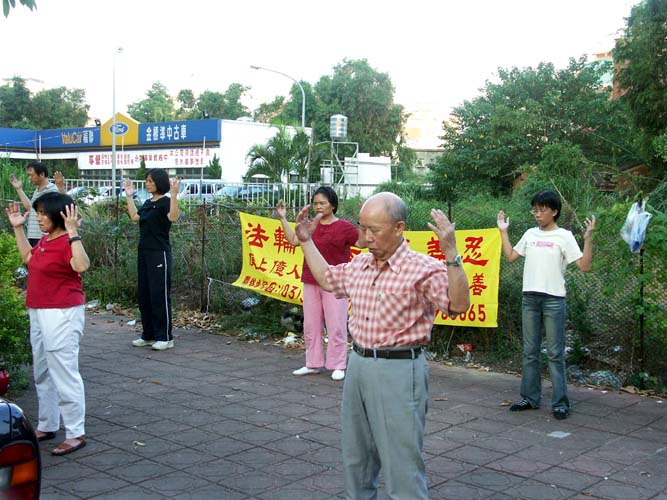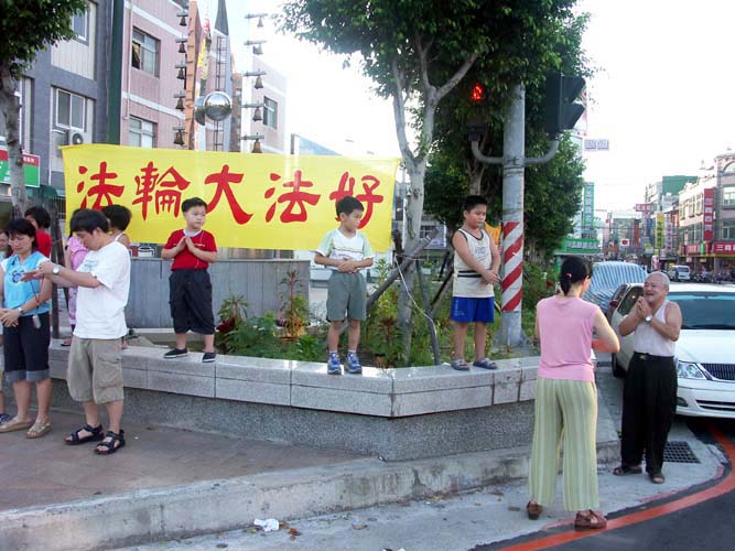 【明慧网2004年9月6日】为支持和配合更大范围“大法洪传台湾大街小巷”的洪法讲真象的形式,台湾内坜地区在2004年9月3日星期六下午,明慧学校小弟子与内坜同修约三十多人,各找了人潮较多的公园和黄昏市场,配合全省同步从5:00-6:10结合户外炼功、洪法、讲真象、发正念的活动,一起出来户外洪法炼功。参与的同修中有老人也有小孩,一组在内坜火车站前方车流多的小公园,一组在人潮多的黄昏市场。