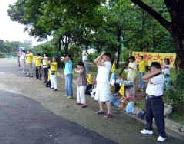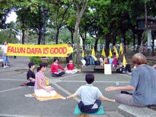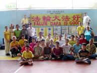 马尼拉有几个炼功点,有一个公园每个周日菲律宾学员会在这里集体炼功。假日早上运动的人很多,绝大多数是菲律宾人,很多人愿意听法轮功真象,甚至当场学炼五套功法。台湾学员将带来的汽球送给小朋友,只见公园到处飘着五颜六色印有“法轮大法好、世界需要真善忍”中、英文字样的汽球;有一个菲律宾人带着全家三口来这个公园休闲度假,一看我们在义务教功,不但自己学炼起来,还找他的家人一起来学炼五套功法。