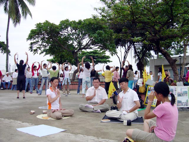 在菲律宾约有300万的华侨,很多人受到江氏集团的不实宣传,对法轮功印象不好,尤其是年纪较大的,有些连看、听都不敢。有几个华人去年来撕横幅踢展板的,今年有一个又来踢展板叫警察,台湾学员欢迎他们找任何单位来,因为来一个就讲清真象一个,每天那个恶人都去告警察,警察都被他弄烦了,也只是来场边绕一下就走了。甚至有一天他们的主管骑车来说“你们要做什么就做什么”还跟一大群来学功的人合唱“法轮大法好”,菲国警察十分支持法轮功。