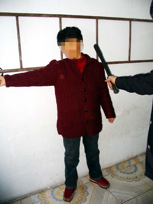 这时天蒙蒙亮了,宋桂芬被挂在墙上,刚挂上一只手,瘦警察冷不防从宋桂芬背后用胶皮棍“呼”地一下子打了下来,还气急败坏地骂:“整死她!把别人写的资料念给她听!”(图9) 然后又把宋桂芬另一只手挂上,用他的脚使劲踩宋桂芬的脚,还用脚踢她的左腿。他们又开始不断的用方便袋套宋桂芬的头、用凉水浇,突然间“咣咣”照她头上几拳,使宋桂芬的头重重地撞在墙上。