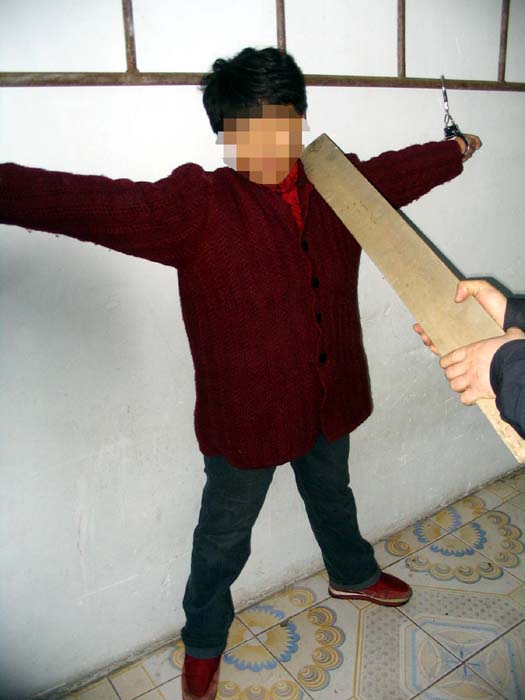 说完后他就到床上休息一会儿,突然他站起来朝宋桂芬小腹猛的踹了一脚,当时她感觉肠子象断了一般。(图4)这时宋桂芬铐在墙上的手疼痛难忍,小腹部位非常痛,而且头昏脑胀。