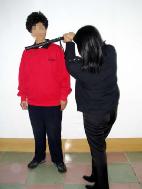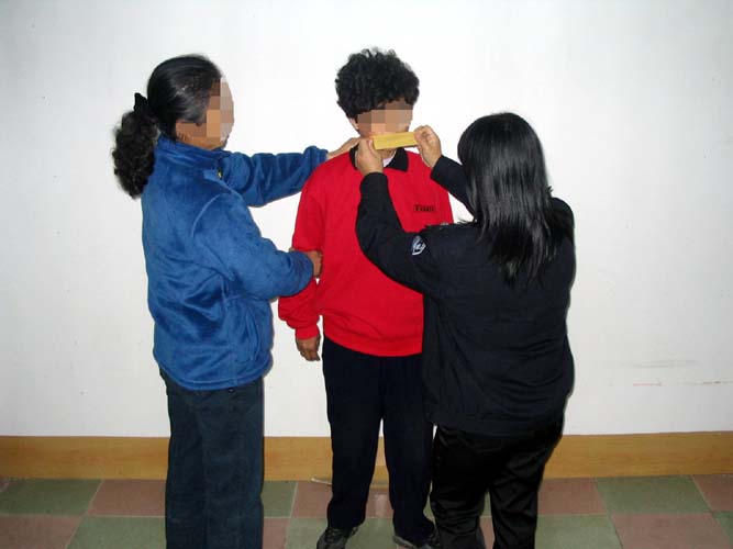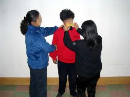 2001年正月因炼功、背《洪吟》证实法轮大法是正法,正月初八那天恶警大队长刘莲英和恶警管教郎翠萍用胶带封了曲淑云嘴两天。(模拟演示图5)