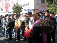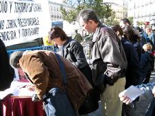 在签字桌前,人们排队等候签字声援法轮功学员、呼吁停止迫害和支持公审江××。一位老先生在自己签字后没有离开,又主动帮助学员发传单并呼吁大家都来签字支持法轮功;有一位女士在了解真象后对学员说,她的工作性质需要她经常去全国各地,她表示会将法轮功真象告诉她在各地的所有的同事和朋友;有几个小伙子开始以为这里是在彩排,看到警察扮演者对着受酷刑的学员扮演者举起警棍,开玩笑的说:“你可别真打呀!”扮演警察的学员告诉他们这里是演示正在中国发生的对法轮功学员的大规模镇压和酷刑迫害,几个小伙子明白后,立即站到了排队签字的队伍中……还有一位先生在听了真象后对学员说,他知道六•四民主运动,知道共产党的独裁专政……。当学员告诉他迫害法轮功的元凶是江××,这位先生说:“这样的人将来结局肯定好不了,祝你们的起诉成功。”