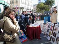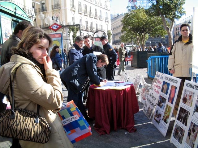 太阳门广场因为地处马德里最中心,街区繁华,人流如潮,在这个地方申请活动一般很难批准。法轮功学员们的申请得到市政府口头批准,但没有书面文件。在反酷刑展开始后不久,警察即来查看批件,但因为没有书面批文,警察只好向上司请示。后来这位警察告诉我们,他的上司在电话中说:“我们了解法轮功,法轮功很和平,没有任何问题。”
