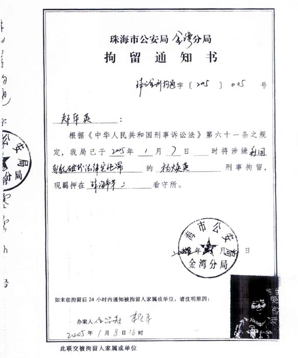 杨焕英是珠海斗门人,于上星期五(2005年1月7日)到东平沙一农场探望亲戚及朋友,当日下午4时在农场遭公安拘捕,现被拘留在珠海第二看守所。珠海专门负责迫害法轮功事务的610办公室当晚9时打电话给杨焕英的丈夫郑华英问他电话和地址,并于10点左右,派人到杨焕英家进行抄家。