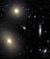 上图为加-法-夏威夷望远镜(Canada-France-Hawaii Telescope)拍摄到的室女座星系团(Virgo cluster of galaxies)的一小部分,室女座星系团离地球约4500万光年,图中两个大型的椭圆星系就是这个星系团中的主宰。天文学家认为椭圆星系应是比较古老、质量比较大的星系,与GDDS的300多个星系中的其中几个很类似,但GDDS的研究对象在80~110亿光年远,可比室女座星系团远多了。而左图画面偏右方及右下角的明亮螺旋星系,离地球算是比较近的,星系呈现蓝色的外表,表示其中的恒星形成相当活跃;GDDS在红移荒漠中观测到的绝大多数星系,其活跃程度则与这些亮蓝螺旋星系类似,但因非常遥远,所以比较昏暗而难于观测。这个画面只是提供给大家参考一下。