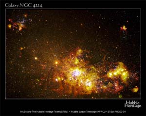 近年来宇宙正在经历许多前所未有的巨变,许多现象有待于更多的科学家认知、综合与思考。这张由NASA的HST于1997年7月提供的照片,向我们展示了在NGC 4214表面恒星形成时的壮观景象。