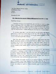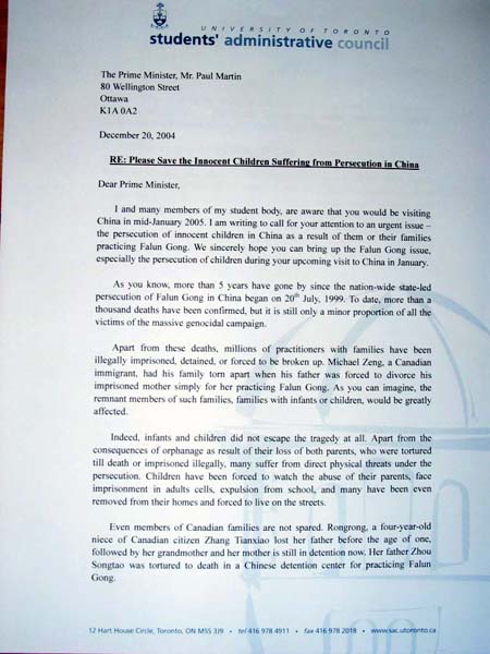 【明慧网2005年1月16日】(明慧记者馨悦编译报道)多伦多大学学生会是加拿大最大的大学学生会之一,代表着四万多全职本科学生。自从99年7月法轮功在中国受到江氏集团的非法镇压和迫害之后,曾先后四次通过决议案,表达了对法轮大法的支持,对这场迫害的谴责,并多次致信加拿大政府呼吁帮助制止这场镇压。在法轮功学员开始营救在中国因为父母修炼法轮功被非法关押甚至被迫害致死而成为孤儿的那些孩子们之后,尤其是当听说加拿大总理在2005年1月中旬将带加拿大代表团出访中国等亚洲国家的时候,多大的学生会特意致信总理马田,希望他在访华期间能够提出法轮功问题,并帮助营救那些在这场迫害中失去了父母的孩子们。以下是该信的原件和翻译内容。