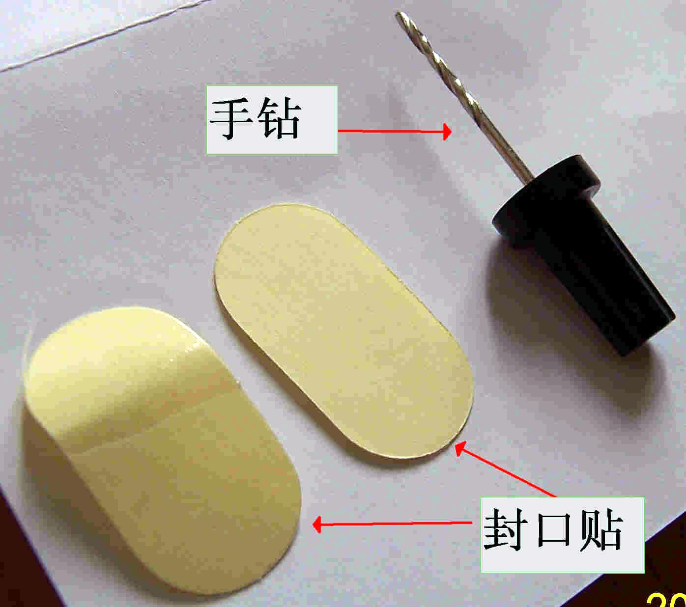 3、 注满后,用一片封口贴封闭两个出气孔。