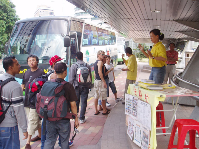 这里法轮功学员们讲真象的对象主要是华人。他们多是来自中国大陆,台湾,香港,新加坡,印尼及大马本土。洪法中感人的事例太多,这里略举一、二。一次一辆巴士停下来,陆陆续续从里走出一群华人,经过洪法点时,学员们热情的送上资料,“法轮功真象资料请各位看看。”“什么?法轮功!我要一份。”这一群人,大概有二十多位,一起围过来,“我也要份”,“我也……”大家伸着手接资料。事后得知他们是来自当地怡保的游客。
