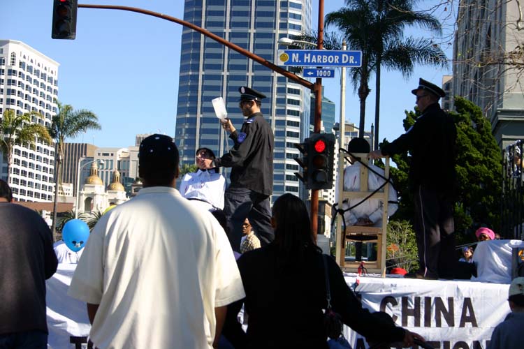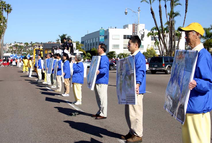 花车后面是四位学员展开的横幅“请帮助制止在中国发生的对法轮功的迫害”。随后的卡车上有三组酷刑演示:蹲小号、老虎凳和野蛮灌食。展车后面是展牌方阵。学员表情庄严肃穆,展牌上展示的是迫害发生前后法轮功的真实故事:大法洪传、学者日众,学员普遍身心受益、道德回升;1999年中共发动对“真、善、忍”的迫害,使无数修炼人备受摧残、家破人亡。