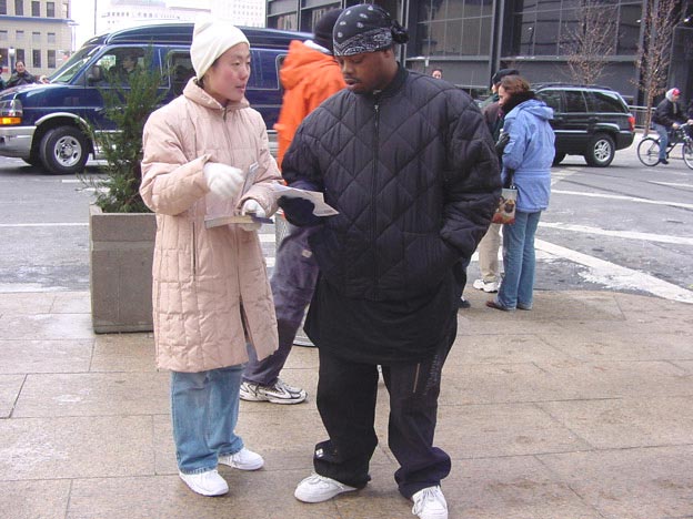一个街头黑人歌唱家看到学员背包上的真象图片后,特别是高蓉蓉脸部被电击毁容的照片,非常的气愤。当学员告诉他江××是出于妒忌之心而迫害法轮功时,他向学员要江××的住址,他要写信质问江××为什么迫害法轮功。他还说,如果他看到江××,他要打断它的膝盖和腿。这位黑人对学员说,这个迫害更甚于希特勒对犹太人的迫害。学员告诉他,可以把信送到中国领事馆,并告诉他领事馆的地址。