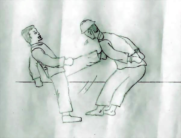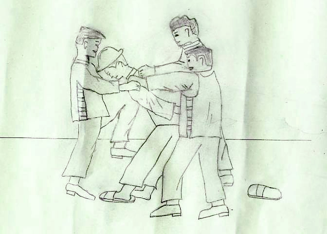 打法轮功学员可得到减期,不打法轮功学员就不让当“四防”,刑事犯在恶警的指使下对法轮功学员凶狠出手,图为“窝心脚”