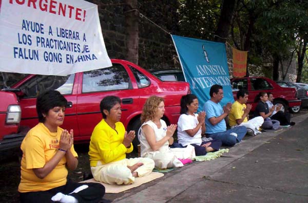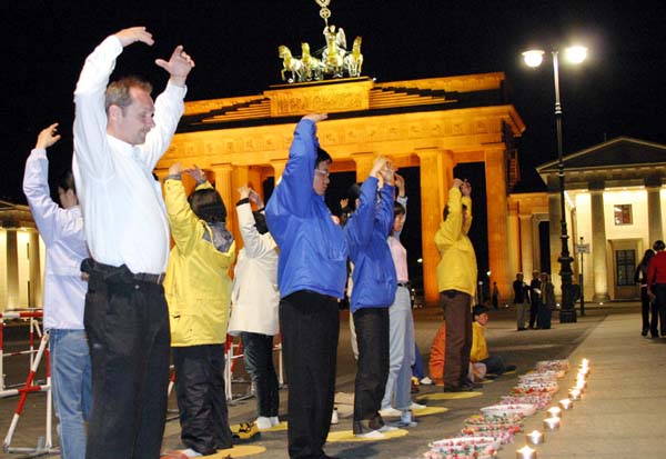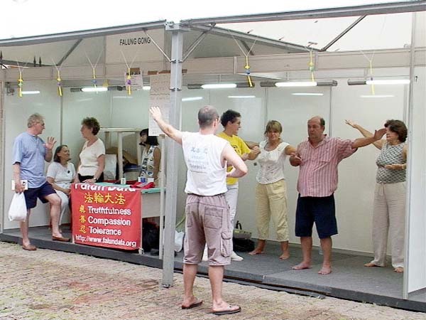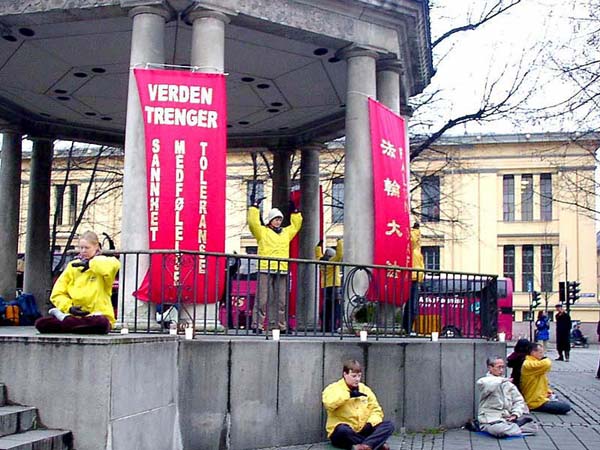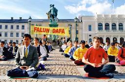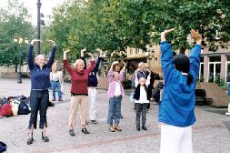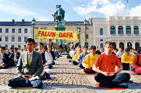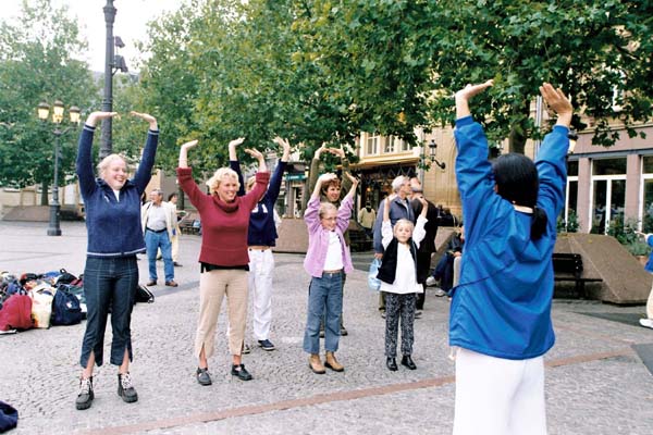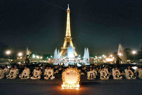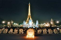 ![]() 2001年6月瑞典哥德堡市中心广场集体炼功 | ![]() 2001年10月法国巴黎埃菲尔铁塔前的集体炼功和烛光守夜 |
