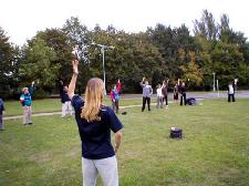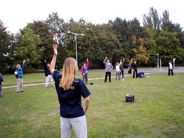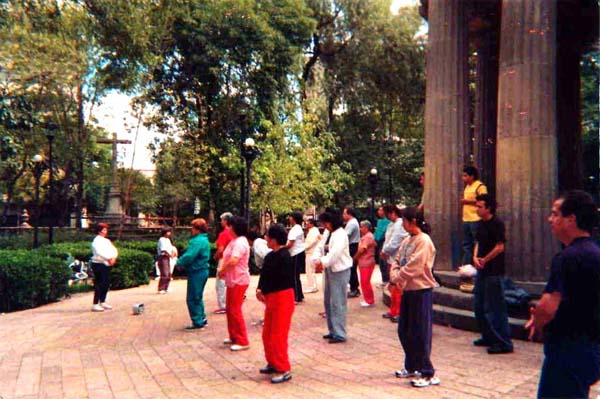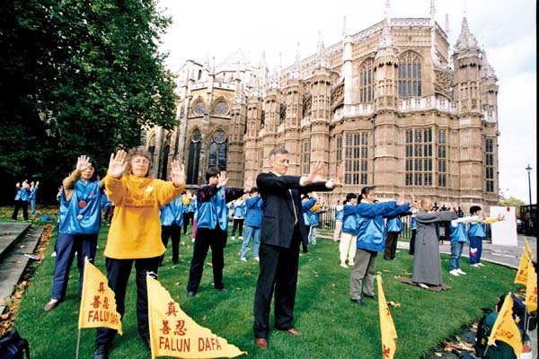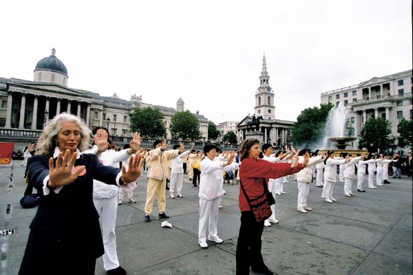 ![]() 英国伦敦集体炼功 | ![]() 2001年10月14日在英国伦敦鸽子广场集体炼功 |
