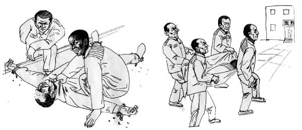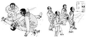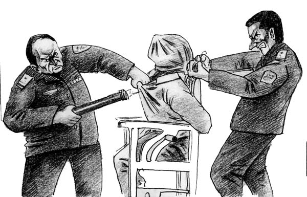 ![]() 图为酷刑之一:头上套塑料袋的描绘 |