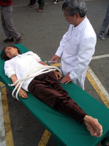 元旦清早,负责展演酷刑的学员及化妆人员纷纷到中正公园布置场地,有的甚至远从台南、新营赶来协助。下午一时许,展演十一种酷刑的受迫害者及公安人员个个粉墨登场鱼贯走进会场,其他学员则在旁发真象资料或演炼功法,约有百余位学员参加这项活动,过程精彩且传神,可说演活了酷刑的真面目,让来参观的民众看得目瞪口呆,当场指责中共江氏集团实在太可恶。