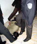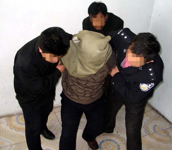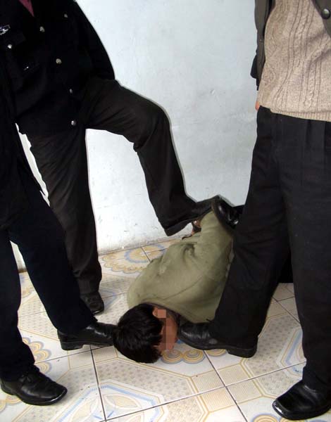 这样恶警们还觉不够劲,于是又用多层塑料口袋套在李文军的头上,封得严严的,不让他喘气,反复折磨生命几乎窒息 (演示图4) ,同时抓着李文军的头狠命的往墙上撞 (演示图5) 。7点钟后恶警们将李文军关到昌邑公安分局大铁笼子里,17日送进吉林市第三看守所。